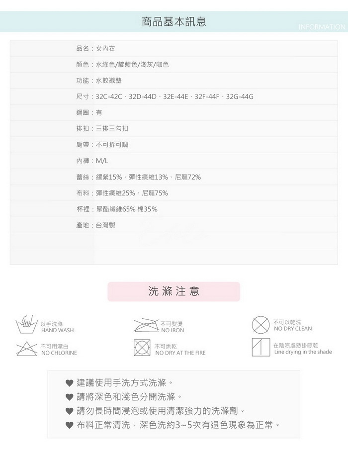 ● C-G罩杯皆附有可拆式魔術水餃襯墊,厚度約0.5CM