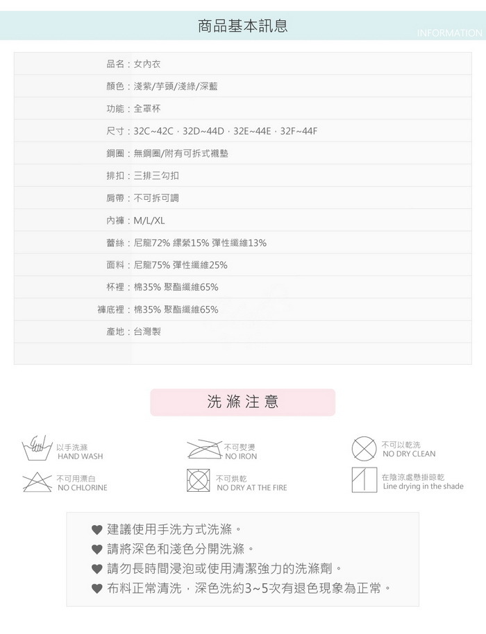 ● C-F罩杯皆附有QQ襯墊,罩杯為可拆式襯墊